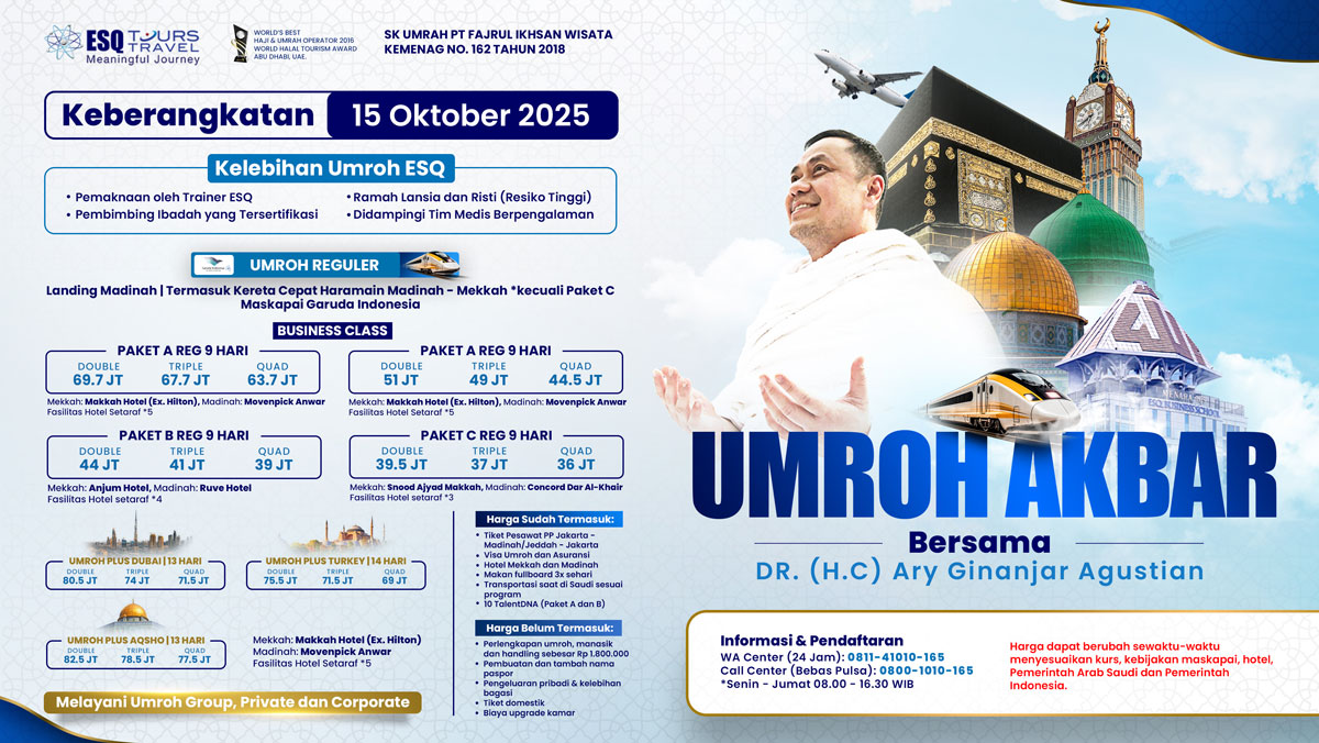 Wujudkan impian beribadah ke Tanah Suci dalam momen istimewa Umrah Akbar bersama Ary Ginanjar, pendiri ESQ, yang akan mendampingi Anda secara langsung. Program ini menghadirkan pengalaman umrah yang berbeda – bukan sekadar menunaikan ibadah, tetapi sebuah perjalanan transformasi diri dengan sentuhan pembinaan ruhiyah khas ESQ.