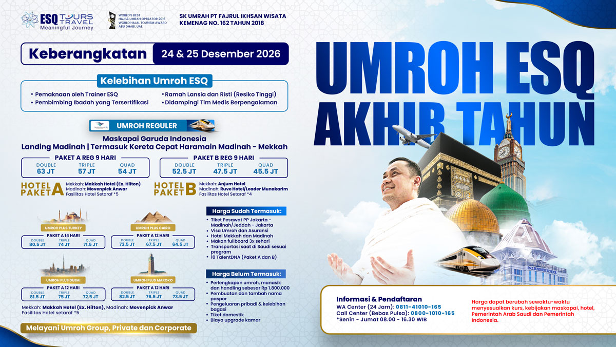 Bersama ESQ Tours, umrah menjadi perjalanan spiritual yang mendalam – bukan hanya menutup tahun, tetapi juga membuka lembaran baru kehidupan dengan penuh keberkahan.