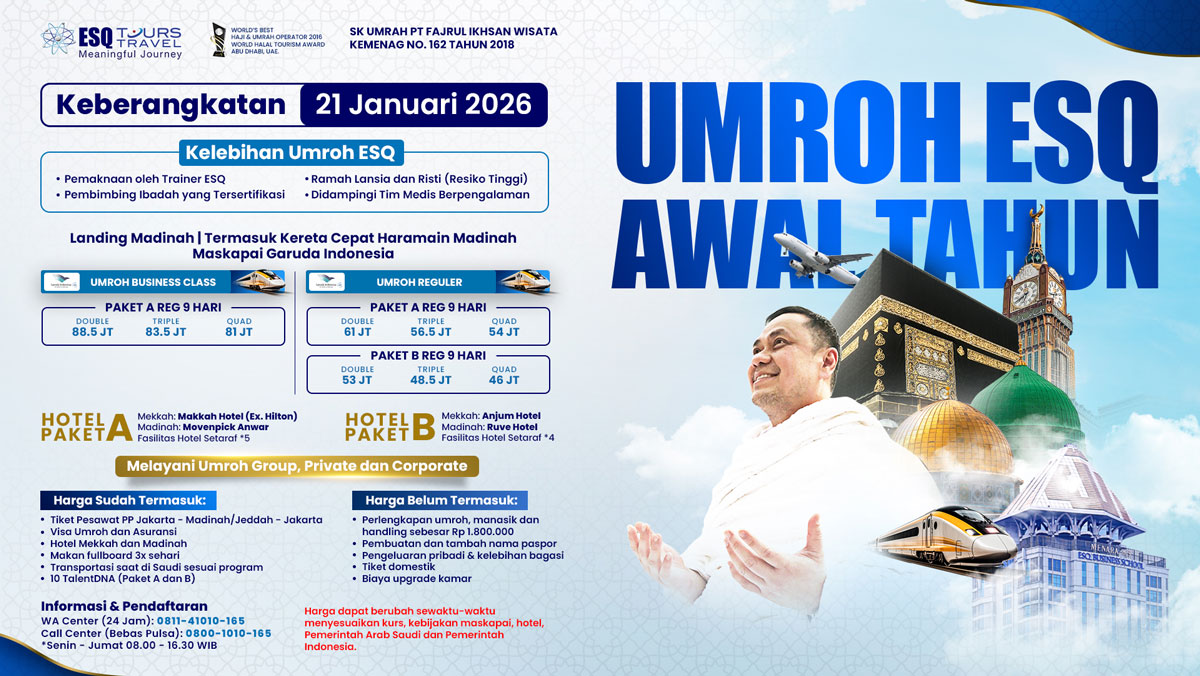 ESQ Tours menghadirkan bukan sekadar perjalanan ibadah, namun juga spiritual journey yang akan menumbuhkan ketenangan hati, memperkuat iman, dan memberikan semangat baru untuk menjalani tahun dengan penuh keberkahan.